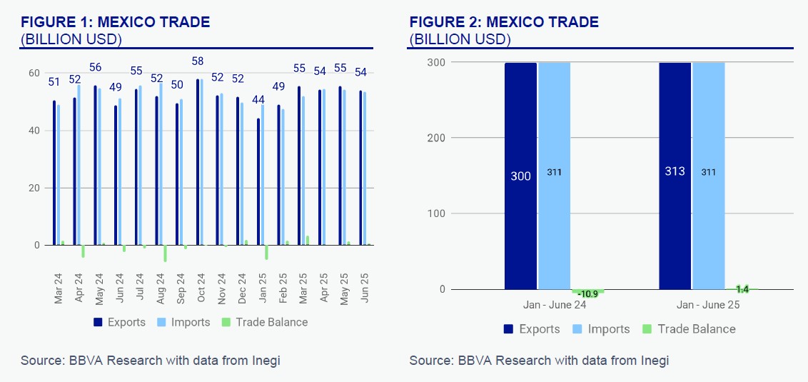 Between January and June 2025, Mexico posted a trade surplus of USD 1.4 billion. Exports reached USD 313 billion, growing by 4.3% compared to the same period in 2024, while imports grew modestly by just 0.2%, totaling USD 311 billion. Monthly export figures have stayed steady, averaging between USD 50 and 56 billion—a sign of a resilient export economy despite external volatility.