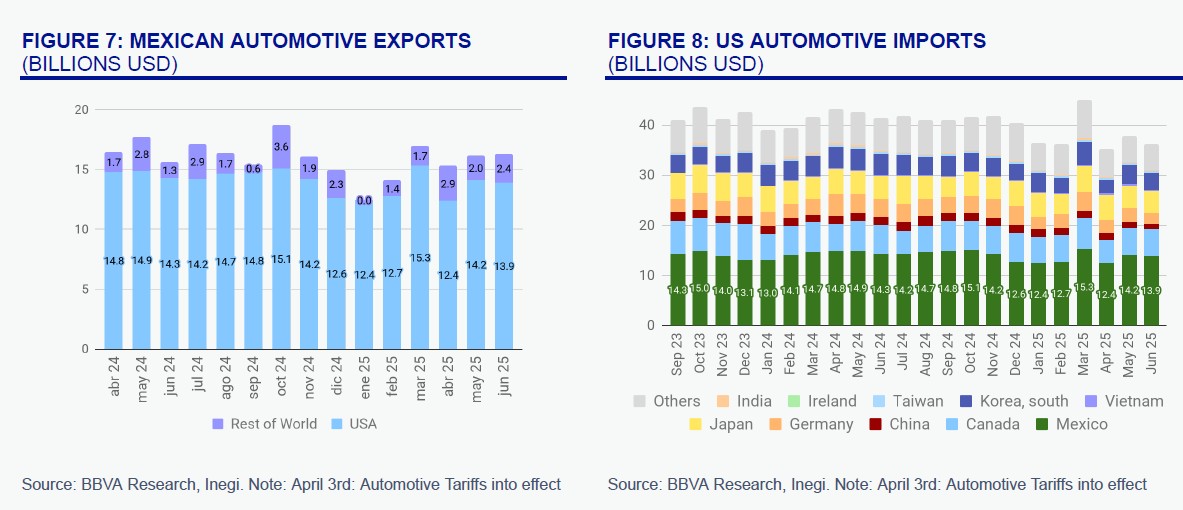 Automotive exports to the U.S. fell by 5.6% YoY, but growth in exports to other countries (+9.6%) helped soften the blow. Importantly, over 82% of Mexico’s exports to the U.S. entered duty-free in 1H 2025—thanks in part to broader use of Chapter 99 exemptions, which bypass many sector-specific tariffs.